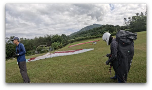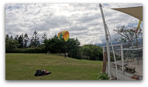 4人くらいがパラグライダーを広げて飛ぶ準備をしています。