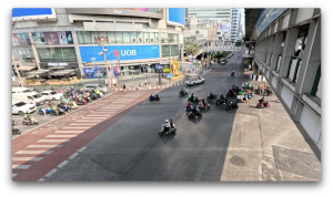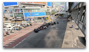 途中、歩道橋の上から見ると、バイクが停止線を越えたところに大量に停まっています。