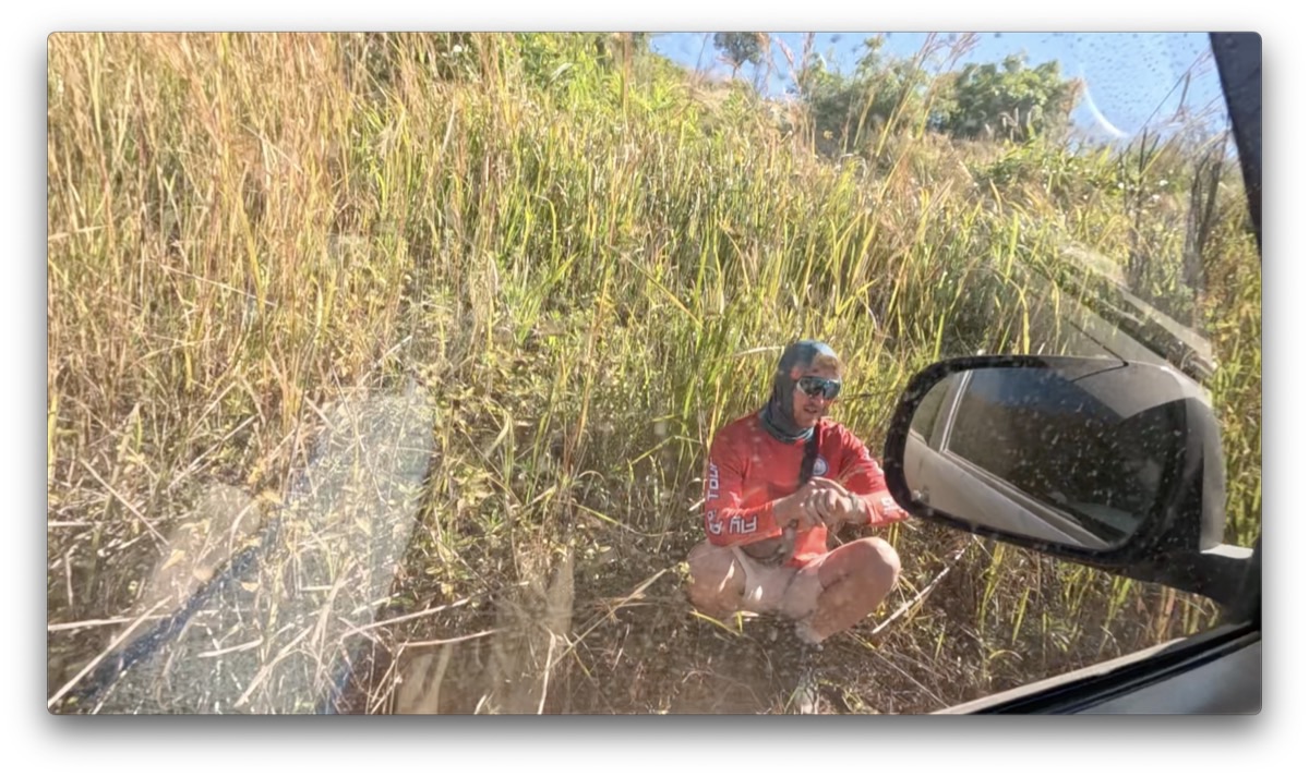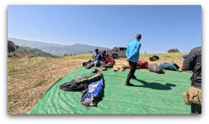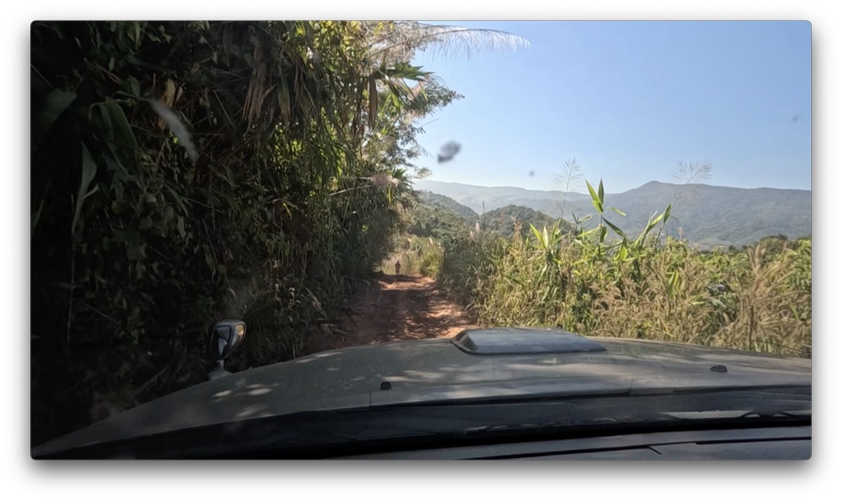 険しい坂道と土埃がひどいので、荷台に乗っていた二人が降りました。