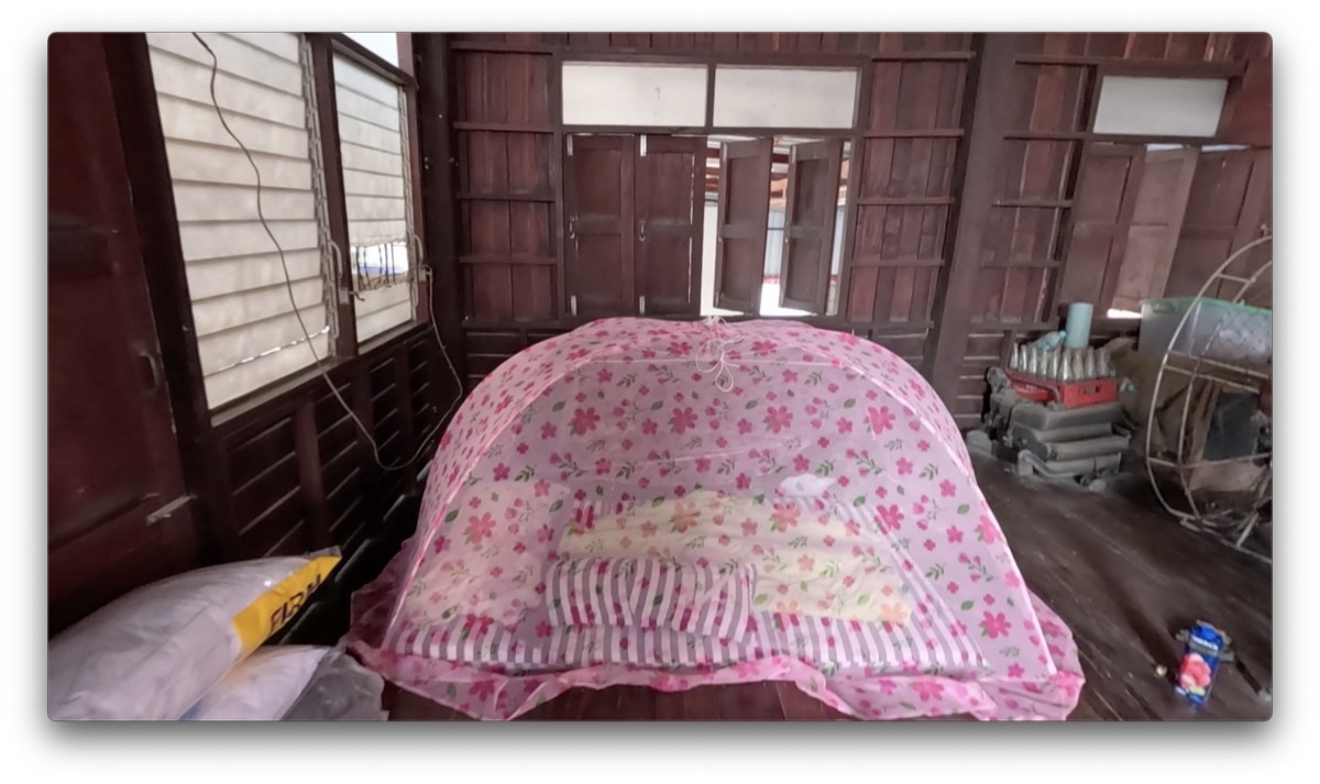 部屋の外だと蚊に刺されるので、簡易蚊帳を使います。