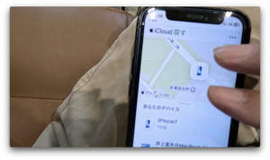 ハタ坊のスマホを使ってiPhoneを探してみたら、復興温泉近くの派出所にあることがわかりました。