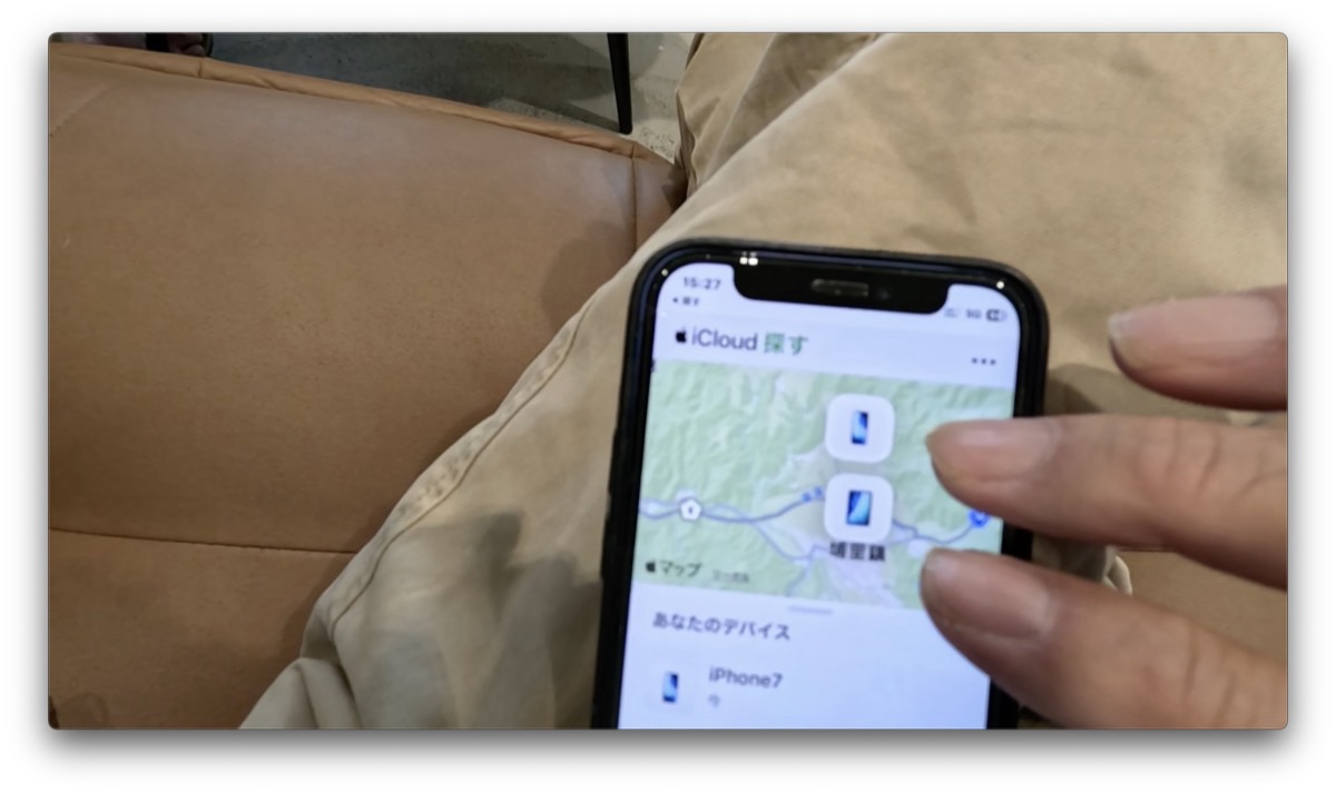 ハタ坊のスマホを使ってiPhoneを探してみたら、復興温泉近くの派出所にあることがわかりました。