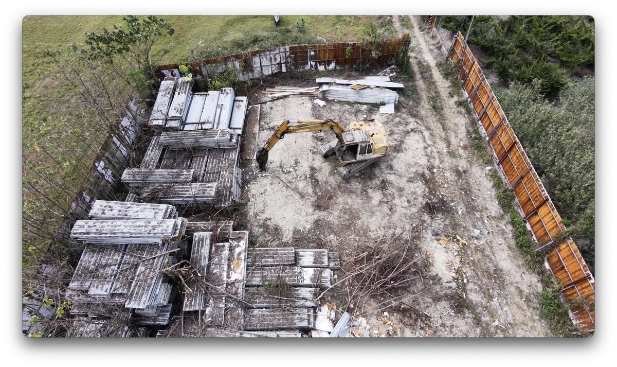 中にはショベルカーが一台あり、周りには長方形の金属の資材が山積みされていました。